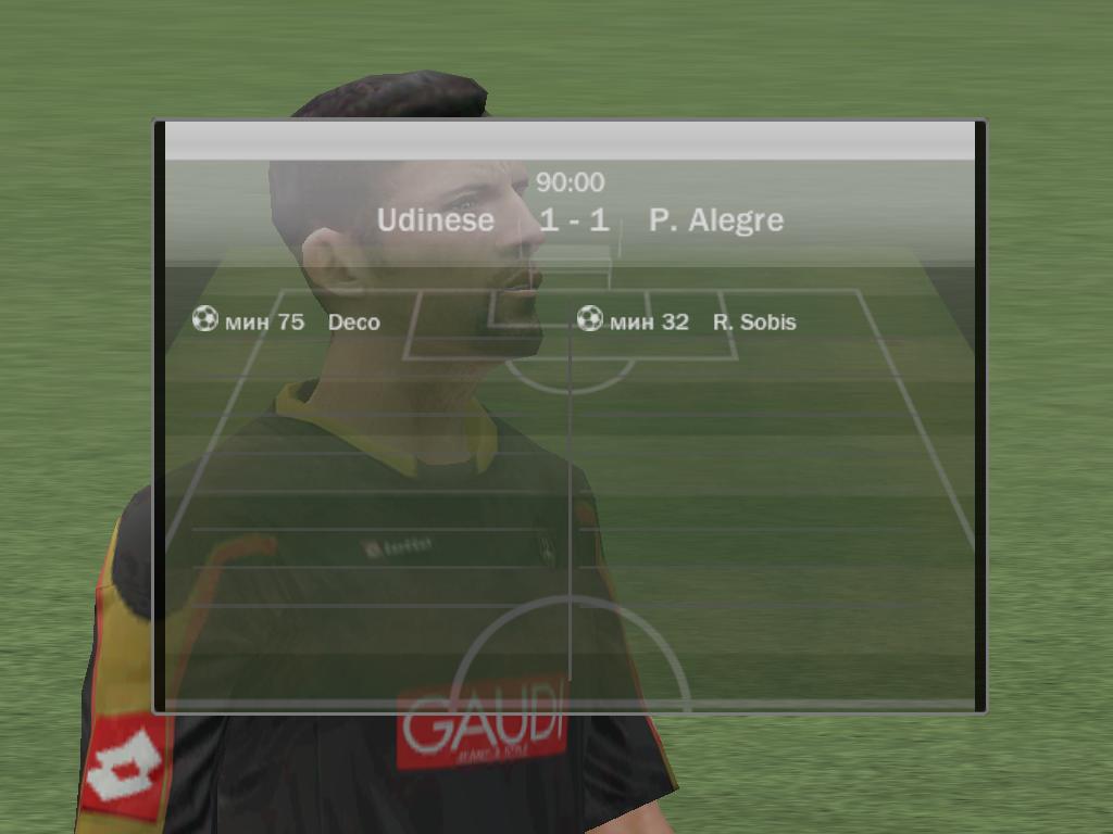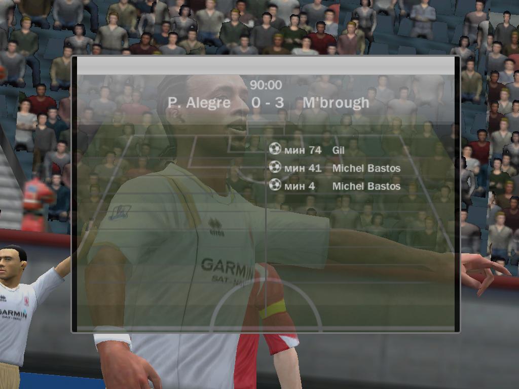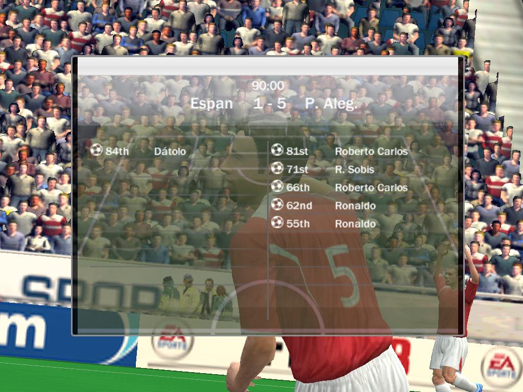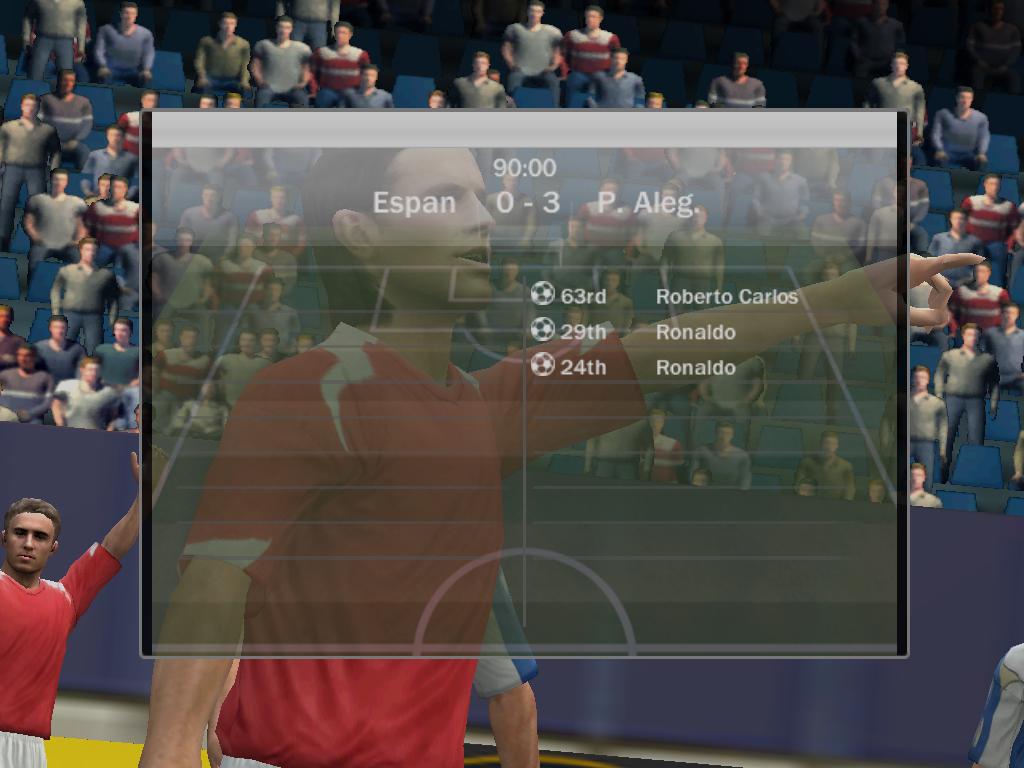| Порто алегре 5:0 ВБА 4-Роналдо, 1 Роб.Карлос (вчера при счете 4:0 разорвала на 72 минуте, доигрывали 18 минут, я был в атаке и забил гол на 19'40 после чего соп разыграл мяч я забрал и вышел, думаю то что соп не разорвал раньше его проблемы)