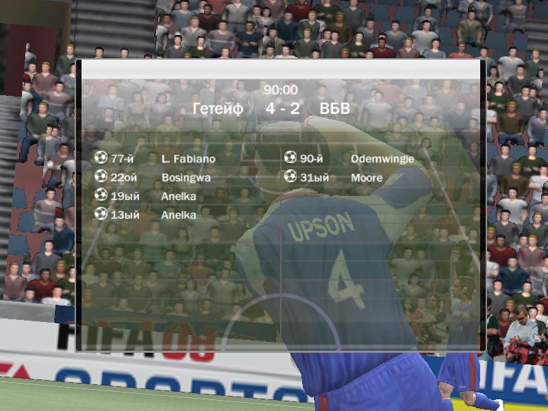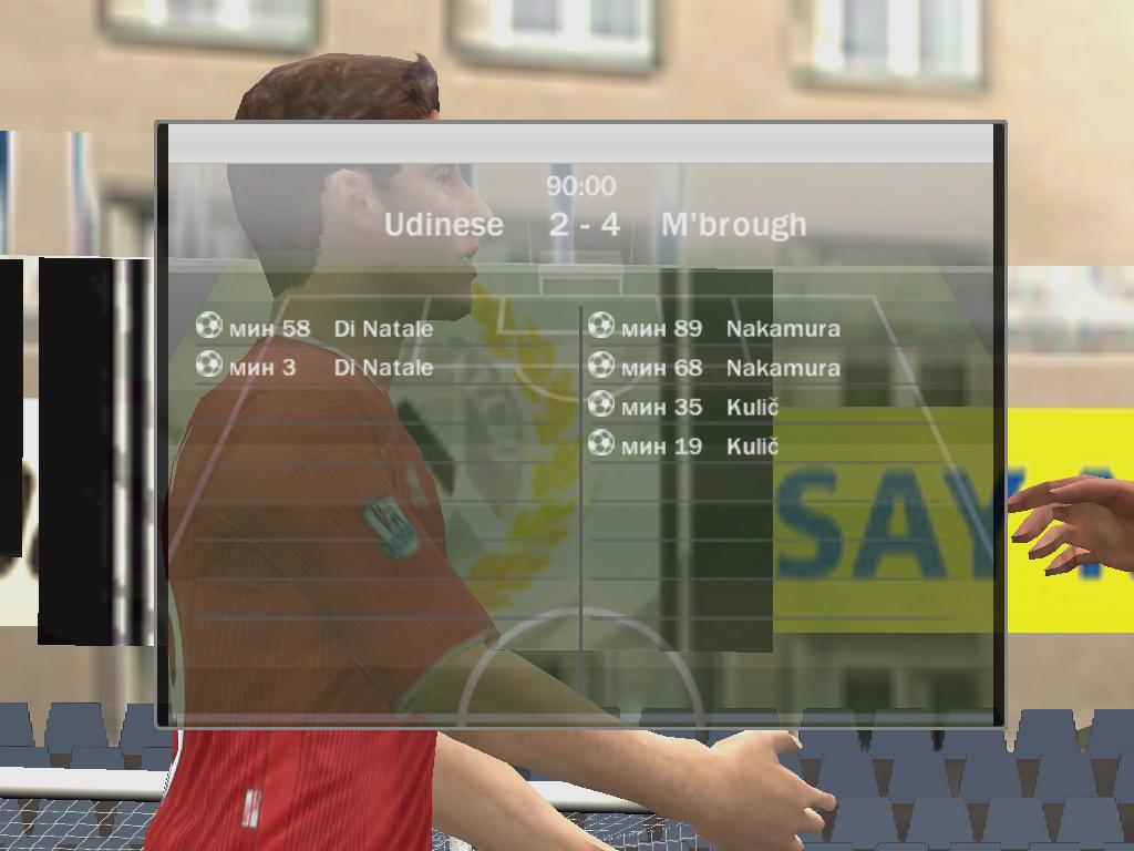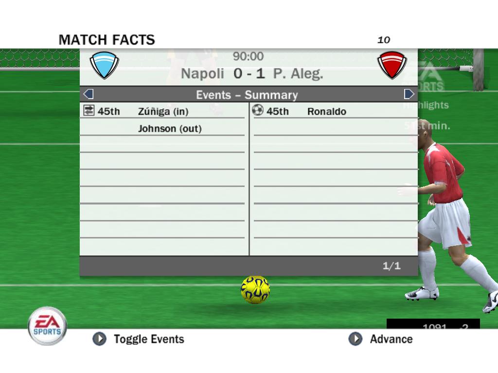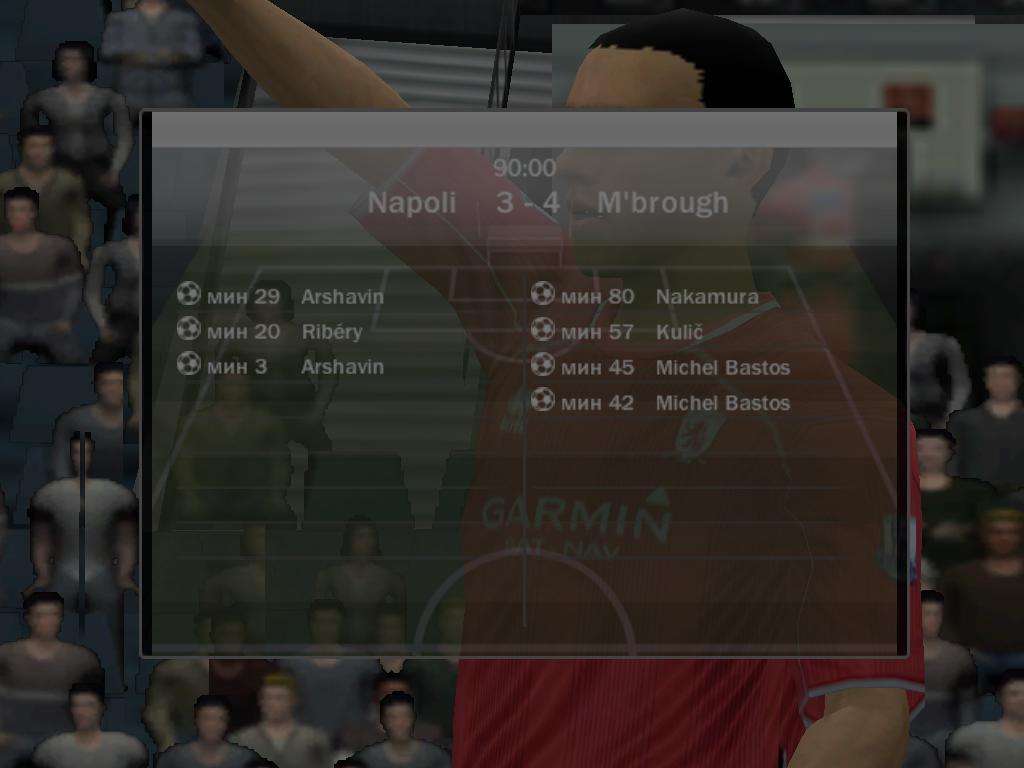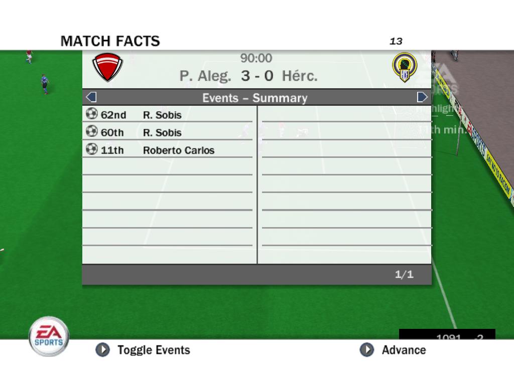 | Порто алегре 5:0 ВБА 4-Роналдо, 1 Роб.Карлос (вчера при счете 4:0 разорвала на 72 минуте, доигрывали 18 минут, я был в атаке и забил гол на 19'40 после чего соп разыграл мяч я забрал и вышел, думаю то что соп не разорвал раньше его проблемы)
